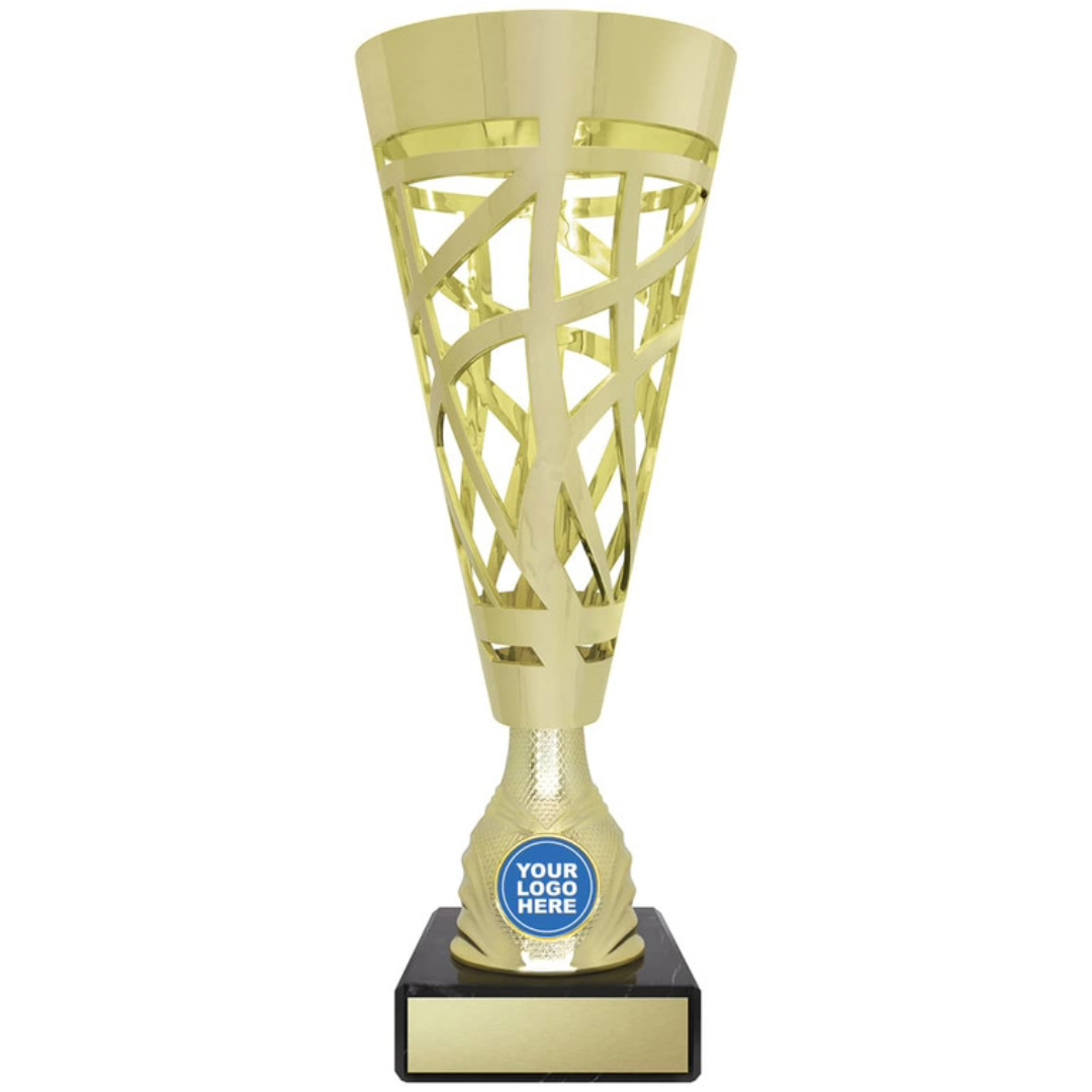 Super interesting design of trophy with swirling design plus great space for your custom insert. The Serafino trophies are available in gold or silver.